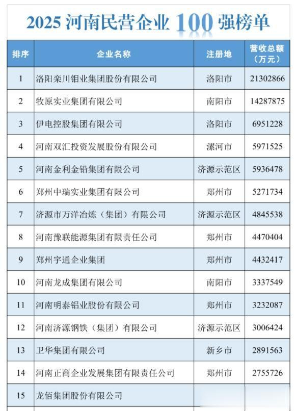 2025河南民营企业100强榜单排名